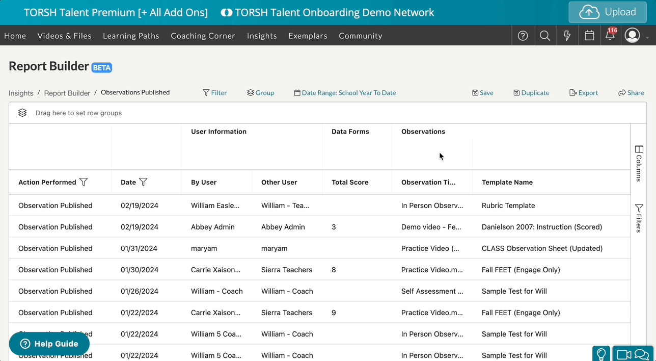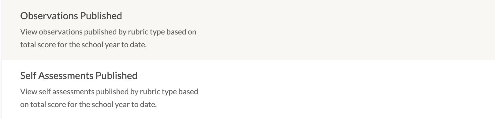 On the 'Standard Reports' list, choose either 'Observations Published' or 'Self Assessments Published.' This will load a report of all observations published - depending on whether or not it was completed as a self assessment or a regular observation. Each report will include completed rubric data made with your new data form rubric templates.