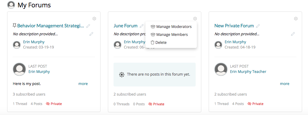 By clicking on the 'gear icon' of  a selected forum, you can take actions like ‘Add/Remove from My Forums,’ ‘Manage Members’ of a private forum, ‘Manage Moderators,’ ‘Delete,’ and Admins can ‘Pin Forums’ to make them appear at the top of the ‘All Forums’ list. You will see different actions for different forums depending on if you are the owner, a moderator, or a member.