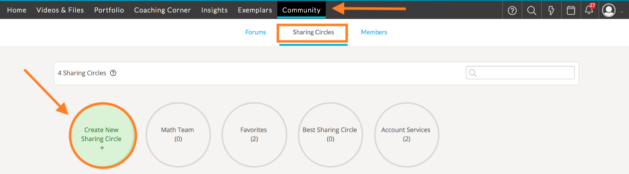 Sharing Circles make it easier for users to frequently share artifacts with a designated group of colleagues in your system. You can create Sharing Circles with other members in your group(s). To do so, navigate to the Sharing Circles tab in Community. Then click ‘Create a New Sharing Circle.’