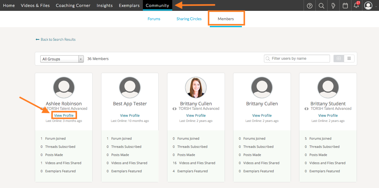 To view the members that exist in your system, select the Community tab from your navigation bar and then select ‘Members.’ On this page, you will see all of the members in your system, along with certain statistics surrounding that member including the number of forums they joined, the number of threads they subscribed to, the number of posts they made, the number of videos and files shared, and the number of exemplars that have been featured. If you wish to view this individual's profile, simply select the ‘View Profile’ link to be taken to their profile page.