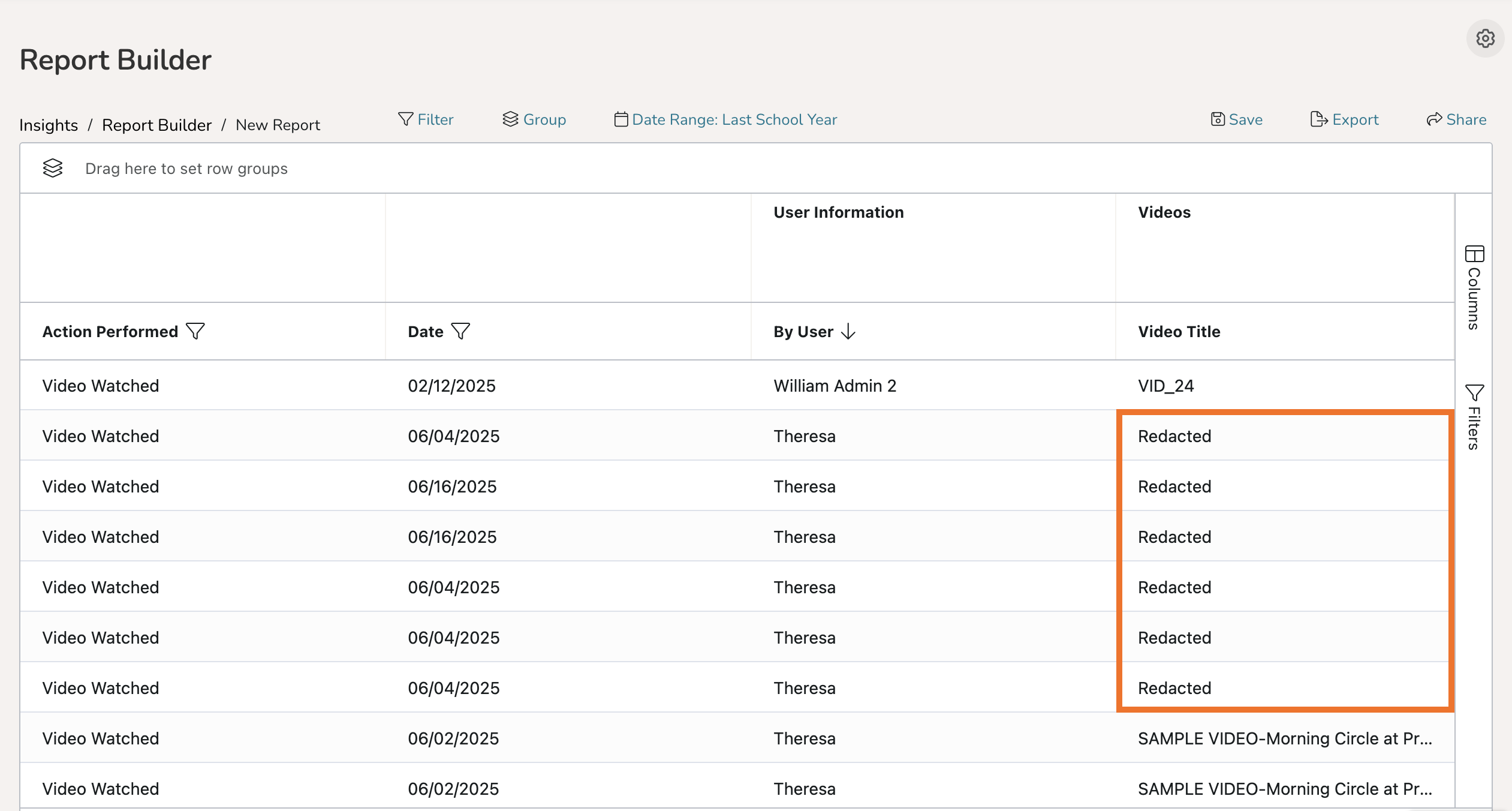 If some of the actions performed you have filtered for in Report Builder appear with 'Redacted' column data, it is because you have not been shared the material being referenced in the report and thus do not have permission to view that associated data.