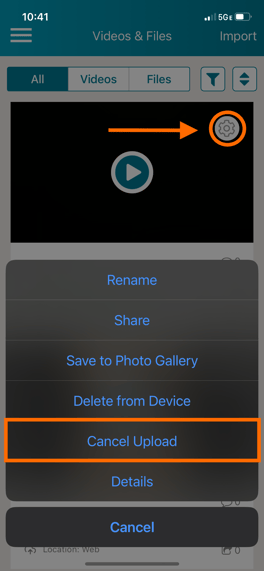 On your Videos & Files page, find the video you are attempting to upload. Tap on its 'gear icon' next to the video and tap 'Cancel Upload' in the menu that appears.