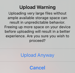 Freeing up more space on your device before uploading will result in a better experience. Are you sure you wish to proceed?