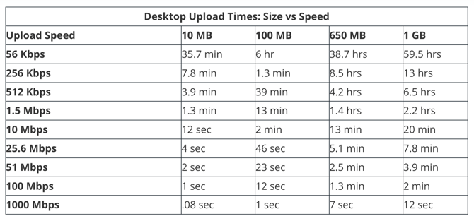 The time videos take to upload is highly dependent on your available upload bandwidth. The FCC legally defines high-speed internet or “broadband” as an internet connection with the following speeds:
